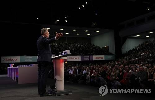 Leader of the British Labour Party Keir Starmer gestures as he makes his keynote speech at the annual party conference in Brighton, England, Wednesday, Sept. 29, 2021.(AP Photo/Alastair Grant)