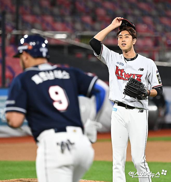 (엑스포츠뉴스 수원, 김한준 기자) 29일 오후 수원케이티위즈파크에서 열린 ‘2021 신한은행 SOL KBO리그’ 두산 베어스와 KT 위즈의 경기, 9회초 무사 1루 KT 김민수가 사구에 맞은 페르난데스에게 모자를 벗어 인사를 하고 있다.