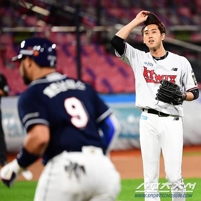 2021 KBO리그 두산베어스와 kt위즈의 29일 수원kt위즈파크에서 열렸다. KT 투수 김민수가 9회초 페르난데스의 몸에 맞는 볼에 대해 사과하고 있다. 수원=최문영 기자 deer@sportschosun.com /2021.09.29/