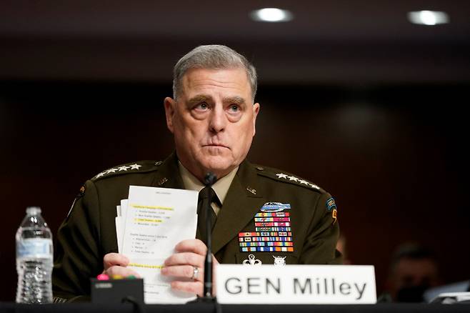 마크 밀리 미국 합참의장(사진)은 28일(현지시간) 지난달 미군의 아프가니스탄 철군으로 20년 전쟁이 탈레반 재집권으로 마무리된 데 대해 ‘전략적 실패’라고 평가했다. 밀리 합참의장은 최소 2500명의 미군 병력을 잔류시키자는 것이 자신의 의견이었다고 밝혔다.