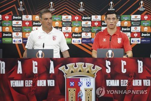 epa09495159 Braga's head coach Carlos Carvalhal (L) and Andre Castro (R) attend a press conference in Braga, Portugal, 29 September 2021. Sporting Braga will face FC Midtjylland in their UEFA Europa League soccer match on 30 September 2021. EPA/HUGO DELGADO
