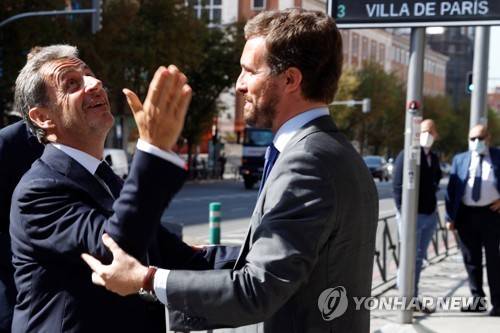 epa09495163 Fomer French president Nicolas Sarkozy (L) chats with Spanish Popular Party's leader, Pablo Casado (R) during the National Convention of the Popular Party held in Madrid, Spain on 29 September 2021. EPA/J.J. Guillen