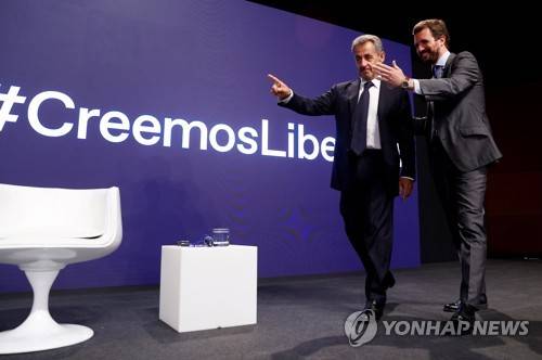 epa09495161 Fomer French president Nicolas Sarkozy (L) and Spanish Popular Party's leader, Pablo Casado (R) attend to the debate 'Open society and its enemies' during the National Convention of the Popular Party held in Madrid, Spain on 29 September 2021. EPA/J.J. Guillen
