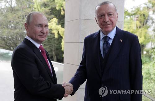epa09495169 Russian President Vladimir Putin (L) welcomes Turkish President Recep Tayyip Erdogan during their meeting at the Bocharov Ruchei residence in Sochi, Russia, 28 September 2021. According to Vladimir Putin, Russia and Turkey have not already compensated for all the losses in trade during the pandemic year and even increased it. The Russian President noted the successful cooperation of Russia with Turkey in Syria and Libya. Also, according to him, Turkey's influence on the situation contributes to reconciliation in Karabakh. EPA/VLADIMIR SMIRNOVSPUTNIK/KREMLIN POOL MANDATORY CREDIT