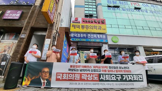 | ▲ 대구경북대학생진보연합은 29일 곽상도 의원의 대구사무소 앞에서 기자회견을 열고 곽 의원의 의원직 사퇴를 촉구했다. |