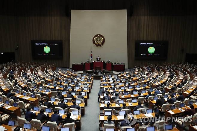 (서울=연합뉴스) 진성철 기자 = 29일 서울 여의도 국회에서 열린 본회의에서 언론-미디어 제도개선 특별위원회 구성의 건이 통과되고 있다. 2021.9.29 [국회사진기자단]