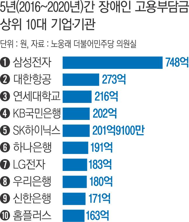 개별 기업 중에서는 삼성전자가 748억원으로 부담금이 가장 많았다. 삼성전자는 지난해 214억원을 포함해 5년 동안 총 748억원을 냈다. 삼성전자의 장애인 고용률은 2016년 1.67%에서 지난해 1.55%로 되레 떨어졌다. 2위는 대한항공(273억원), 3위는 학교법인 연세대학교(216억원), 4위는 KB국민은행(202억원), 5위는 SK하이닉스(201억9100만원)였다.