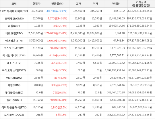 하락세를 보이는 가상화폐는 비트코인캐시에이비씨 1종목으로 전일 대비하여 현재 -3.36% 하락한 307,500원에 거래되고 있다.