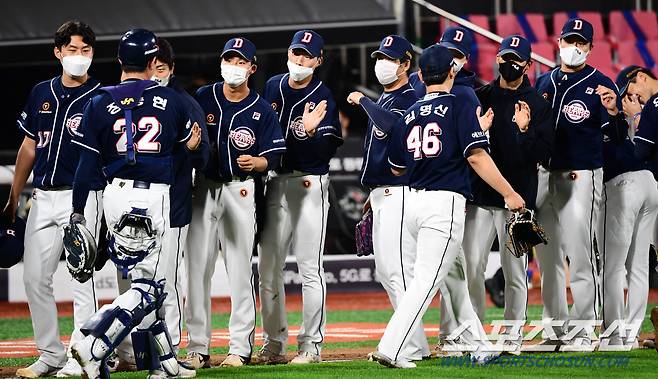 2021 KBO리그 두산베어스와 kt위즈의 29일 수원kt위즈파크에서 열렸다. 두산 마무리 김명신의 팀의 8대3 승리를 확정짓고 동료들과 환호하고 있다. 수원=최문영 기자 deer@sportschosun.com /2021.09.29/