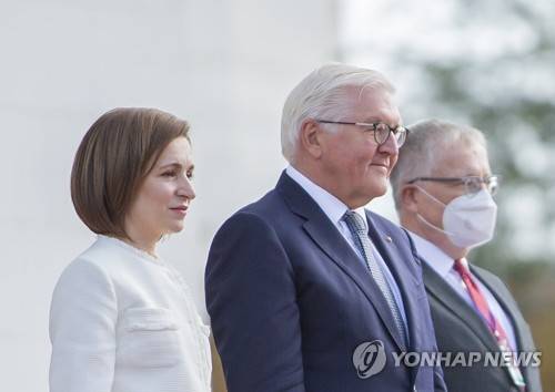 epa09495204 Moldovan President Maia Sandu (L) pictured with German President Frank-Walter Steinmeier (C) in front of the Presidential Palace during his official visit in Chisinau, Moldova, 29 September 2021. EPA/DUMITRU DORU