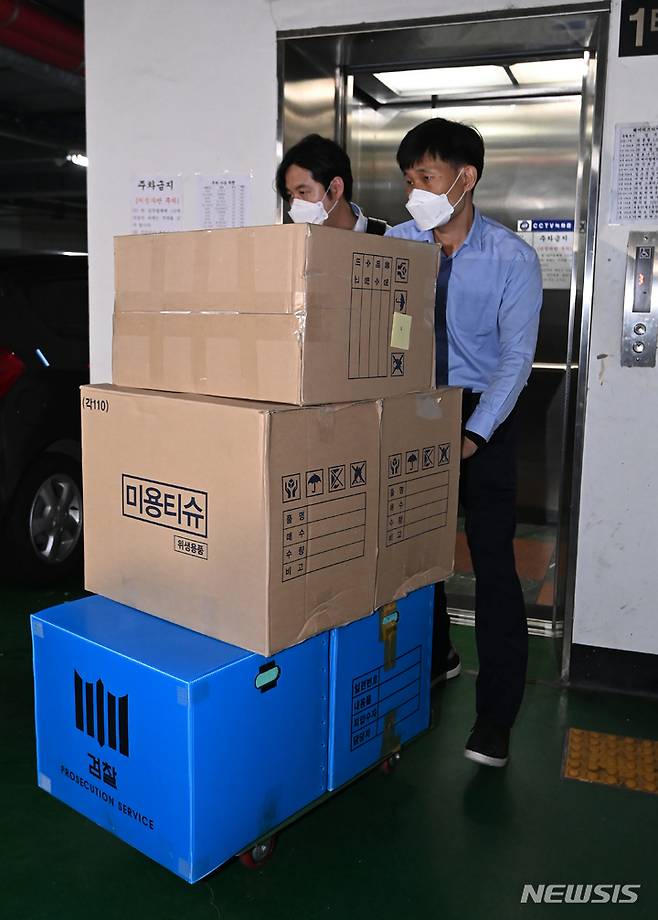 [성남=뉴시스] 김종택기자 = 서울중앙지검 대장동 개발의혹 사건 전담수사팀이 29일 오후 경기도 성남시 분당구 자산관리사 화천대유 사무실에서 대장동 개발사업의 특혜 의혹과 관련한 압수수색을 마친 뒤 압수품을 차량에 옮기고 있다. 2021.09.29.