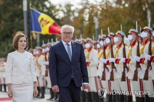epa09495207 Moldovan President Maia Sandu (L) reviews the honor guard together with German President Frank-Walter Steinmeier (R) in front of the Presidential Palace in Chisinau, Moldova, 29 September 2021. EPA/DUMITRU DORU