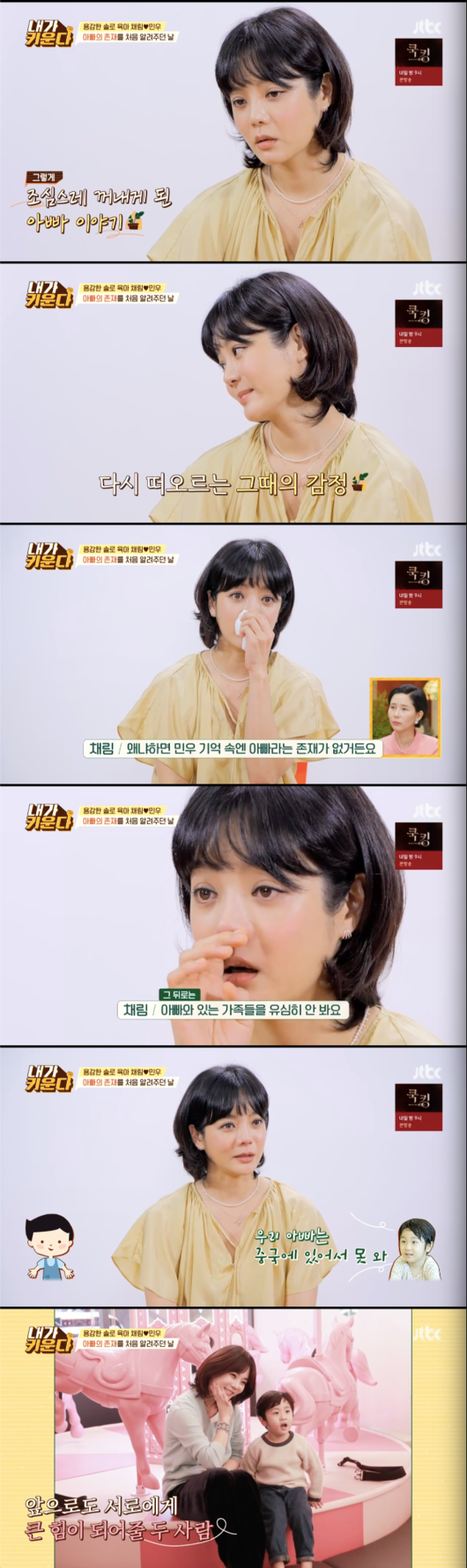 채림은 “처음 아이한테 아빠 보고 싶냐고 물었을 땐 아니라고 하더라. 그래서 아이한테 아빠가 없는게 아니라 아빠가 있다고 말하니 아이의 표정이 달라졌다.”고 말했다. 이어 “민우의 기억속에는 아빠라는 존재가 없다. 아이한테 아빠가 있지만 지금 보러올 수가 없는 상황이라고 말하며 사진을 보여줬다”고 말하며 눈물을 흘렸다.