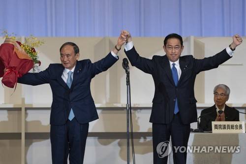 Japanese former Foreign Minister Fumio Kishida, right, celebrates with outgoing Prime Minister Yoshihide Suga after being announced the winner of the Liberal Democrat Party leadership election in Tokyo Wednesday, Sept. 29, 2021. Kishida won the governing party leadership election on Wednesday and is set to become the next prime minister, facing the imminent task of addressing a pandemic-hit economy and ensuring a strong alliance with Washington to counter growing regional security risks. (Carl Court/Pool Photo via AP) POOL PHOTO