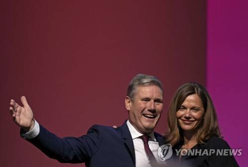 Leader of the British Labour Party Keir Starmer gestures as he stands with his wife Victoria after making his keynote speech at the annual party conference in Brighton, England, Wednesday, Sept. 29, 2021.(AP Photo/Alastair Grant)