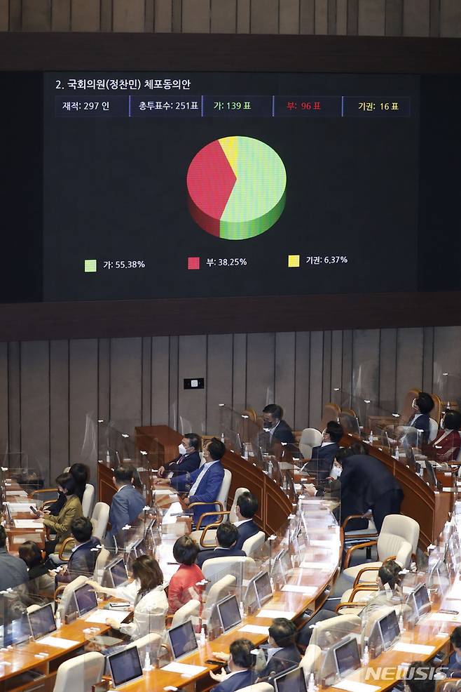 [서울=뉴시스] 최동준 기자 = 29일 서울 여의도 국회에서 열린 본회의에서 정찬민 국민의힘 의원 체포동의안이 통과되고 있다. 2021.09.29. photocdj@newsis.com