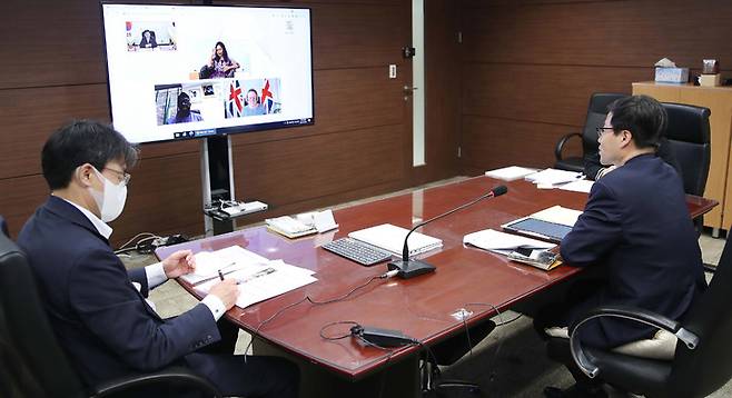 [서울=뉴시스] 추상철 기자 = 여한구 산업통상자원부 통상교섭본부장이 29일 오후 서울 중구 대한상공회의소 영상회의실에서 '세계무역기구(WTO) 퍼블릭 포럼'에 화상으로 참석해 있다. (사진= 산업통상자원부 제공) 2021.09.29. photo@newsis.com *재판매 및 DB 금지
