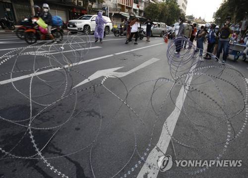 epa09495259 Anti-government protesters use barbed wire to block a road ?during a street protest calling for the resignation of the Thai prime minister, near the Government House in Bangkok, Thailand, 29 September 2021. Anti-government protesters took part in street rallies calling for the ouster of the Thai premier over the government's handling of the COVID-19 crisis. EPA/NARONG SANGNAK