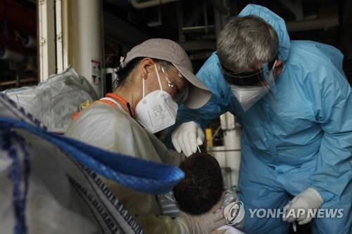 An Italian doctor carries out a COVID-19 test for a 7-week-old baby onboard the Geo Barents, a rescue vessel, at the port of Augusta, on the island of Sicily, Italy, Wednesday, Sept. 29, 2021. (AP Photo/Samy Magdy)