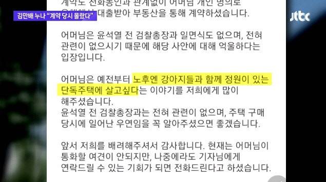 JTBC 보도에 따르면 김씨 아들이 “어머니는 계약 당시엔 이 주택이 윤 전 총장 아버지 집인 걸 몰랐다. 어머니가 정원 있는 집에서 개를 키우면서 살고 싶다고 말해왔다”고 해명했다.