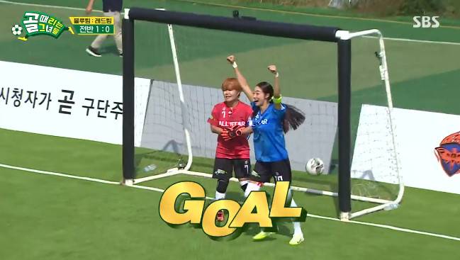 '골 때리는 그녀들' 블루팀 최여진이 첫 번째로 골을 성공시켰다.
