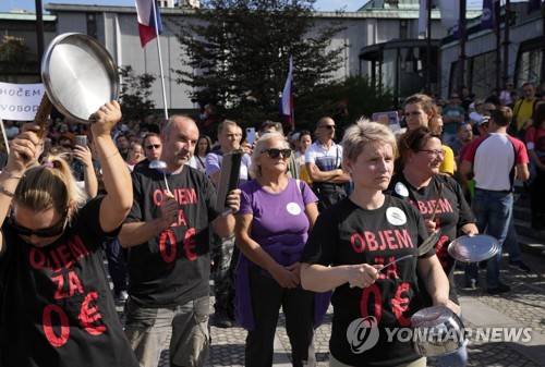 People bang pots with a spoons during a protest against vaccination and coronavirus measures in Ljubljana, Slovenia, Wednesday, Sept. 29, 2021. Slovenia suspended Johnson & Johnson jabs while probing a death of a 20-year-old woman. The suspension will be in place until experts examine possible link between the woman's death of a stroke two weeks after she received a Johnson & Johnson vaccine. (AP Photo/Darko Bandic)