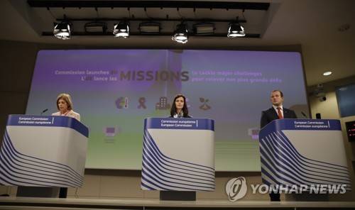 epa09495266 (L-R) European Health Commissioner Stella Kyriakides, European Innovation Commissioner Mariya Gabriel and EU Environment, Oceans and Fisheries Commissioner Virginijus Sinkevicius present five EU missions to tackle major challenges during a press conference in Brussels, Belgium, 29 September 2021. The Commission launched five new EU missions, a new and innovative way to work together and improve the lives of people in Europe and beyond. EU missions aim to tackle big challenges in health, climate and the environment, and to achieve ambitious and inspiring goals in these areas. EPA/OLIVIER HOSLET