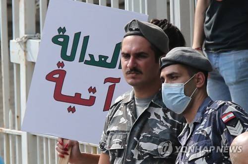 epa09495277 Anti-government activists and families of Beirut Blast victims take part in a protest, in front the Justice Palace in Beirut, Lebanon, 29 September 2021, to support the Public Prosecutor, Judge Tareq Bitar, under slogan 'Tariq Bitar, the truth will protect him and the people will redeem him'. Hezbollah security official Wafiq Safa, as well as some suspected parliamentarians and ministers, who were summoned by the public prosecutor and refused to attend, reportedly threatened Bitar on the pretext that the investigation was politicized. EPA/NABIL MOUNZER