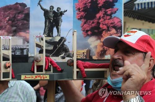 epa09495285 Anti-government activists and families of Beirut Blast victims take part in a protest, in front the Justice Palace in Beirut, Lebanon, 29 September 2021, to support the Public Prosecutor, Judge Tareq Bitar, under slogan 'Tariq Bitar, the truth will protect him and the people will redeem him'. Hezbollah security official Wafiq Safa, as well as some suspected parliamentarians and ministers, who were summoned by the public prosecutor and refused to attend, reportedly threatened Bitar on the pretext that the investigation was politicized. EPA/NABIL MOUNZER