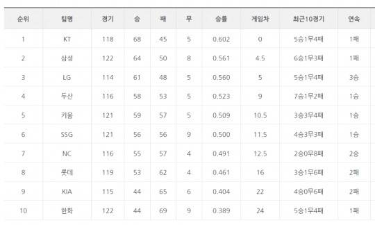 [프로야구 29일 팀 순위]두산은 곽빈 호투로 kt에 전날 패배 설욕하며 4위 굳히기..NC, 8연패 뒤 2연승으로 다시 가을야구 진출 꿈꿔