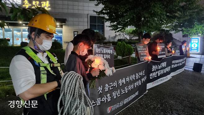 민주노총 특성화고노동조합 조합원들이 29일 서울 동대문구 한 병원 앞에서 최근 아파트 외벽을 청소하다 추락사한 20대 청년노동자를 추모하며 촛불을 들고 있다.