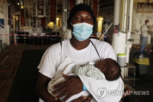 A migrant carries his 7-week-old baby onboard the Geo Barents, a rescue vessel, at the port of Augusta, on the island of Sicily, Italy, Wednesday, Sept. 29, 2021. (AP Photo/Samy Magdy)