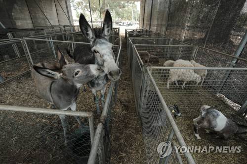 epaselect epa09494937 Donkeys are seen after the Town Hall of El Paso enabled the place were the cattle market normally took place to accommodate evacuated animals from the areas affected by the eruption of the Cumbre Vieja volcano in La Palma, Canary Islands, Spain, 29 September 2021. More than 130 animals are being kept there until their owners can get back to them. EPA/Angel Medina G.