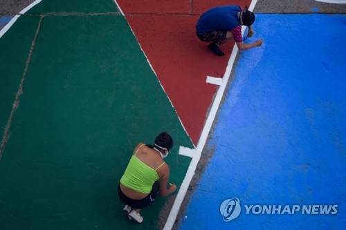 epa09495361 Children and youth help paint as part of a makeshift basketball court recovery program, in Caracas, Venezuela, 21 September 2021 (issued 29 September 2021). It is five in the afternoon in Caracas. In the popular neighborhood of Las Palmas, which just two months ago became the scene of a pitched battle between policemen and 'thugs', the neighbors return home and, although they still have fear in their bodies, they are no longer imprisoned by violence. Perhaps the word 'court' is somewhat exaggerated. Around a hoop in the middle of the street, they strive to paint the lines of a very vertical field. It is an initiative of the neighbors, besieged until recently by the violence of the 'underworld', which turned them into prisoners in their own neighborhood. EPA/Miguel Gutierrez