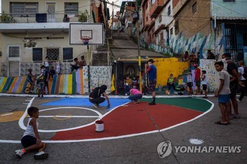 epa09495363 Children and youth help paint as part of a makeshift basketball court recovery program, in Caracas, Venezuela, 21 September 2021 (issued 29 September 2021). It is five in the afternoon in Caracas. In the popular neighborhood of Las Palmas, which just two months ago became the scene of a pitched battle between policemen and 'thugs', the neighbors return home and, although they still have fear in their bodies, they are no longer imprisoned by violence. Perhaps the word 'court' is somewhat exaggerated. Around a hoop in the middle of the street, they strive to paint the lines of a very vertical field. It is an initiative of the neighbors, besieged until recently by the violence of the 'underworld', which turned them into prisoners in their own neighborhood. EPA/Miguel Gutierrez