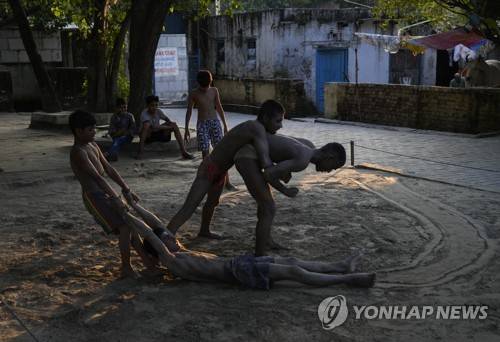 Children play and wrestle on a ghat of the river Yamuna in New Delhi, India, Wednesday, Sept. 29, 2021. (AP Photo/Manish Swarup)