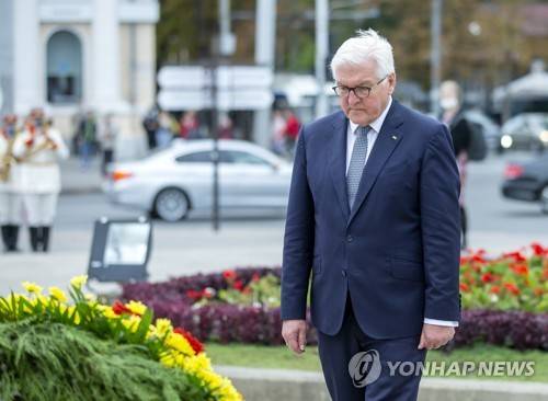epa09495403 President of Germany Frank-Walter Steinmeier lays flowers at Stefan cel Mare (Stephen the Great) monument during his official visit in Chisinau, Moldova, 29 September 2021. EPA/DUMITRU DORU