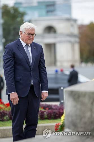 epa09495404 President of Germany Frank-Walter Steinmeier lays flowers at Stefan cel Mare (Stephen the Great) monument during his official visit in Chisinau, Moldova, 29 September 2021. EPA/DUMITRU DORU