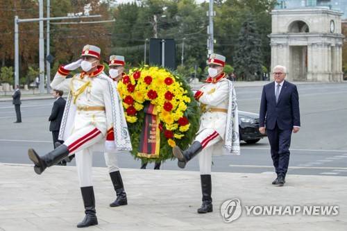 epa09495402 President of Germany Frank-Walter Steinmeier lays flowers at Stefan cel Mare (Stephen the Great) monument during his official visit in Chisinau, Moldova, 29 September 2021. EPA/DUMITRU DORU