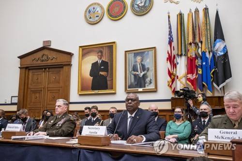 epa09495425 United States Secretary of Defense Lloyd J. Austin III (C) offers his opening remarks during a House Armed Services Committee hearing on 'Ending the U.S. Military Mission in Afghanistan' in the Rayburn House Office Building in Washington, DC, USA, 29 September 2021. EPA/Rod Lamkey / POOL