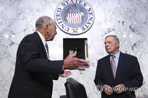 epa09495452 U.S. Senate Judiciary Committee Ranking Member Chuck Grassley speaks with Chairman Dick Durbin prior to a Senate Judiciary Committee hearing to examine Texas's abortion law on Capitol Hill in Washington, DC, USA, 29 September 2021. EPA/TOM BRENNER / POOL