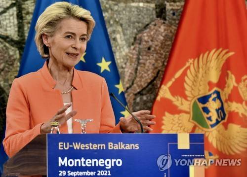 European Commission President Ursula von der Leyen speaks during a press conference after talks with Montenegro's President Milo Dukanovic in Podgorica, Montenegro, Wednesday, Sept. 29, 2021. Von der Leyen is visiting the six Balkan countries to assure their future is in the EU. The Western Balkan countries — Albania, Bosnia, Kosovo, Montenegro, North Macedonia and Serbia — are at different stages on the EU membership path. (AP Photo/Risto Bozovic)
