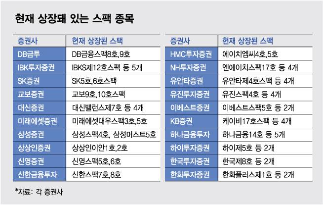 신한금융투자, 유진투자증권, 교보증권, 이베스트투자증권, 하이투자증권, IBK투자증권, 유안타증권, 상상인증권, 한화투자증권 등이 스팩 종목을 다수 상장시켜두고 유망 비상장사를 물색하고 있다.