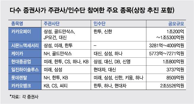 한 증권사 IPO 담당 임원은 "주관사 입장에서도 단독으로 대형 종목의 상장을 주관하면 독점적으로 누리는 수수료 수익도 커지겠지만 그만큼 부담도 커진다"며 "지난해 IPO 시장 호황이 본격화된 이후 대형 딜 뿐 아니라 중소형 딜에서도 증권사들이 서로의 딜에 공동 주관 또는 인수단으로 이름을 올리면서 위험을 분담하는 모습이 늘었다"고 했다.