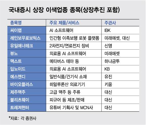 특히 AI 및 메타버스(가상세계) 테마의 기업들이 자주 눈에 띄었다. 의료용 AI 소프트웨어 제조사 뷰노(미래에셋증권, 이하 괄호 안은 주관사)와 앞서 언급한 씨이랩 등이 있다. 메타버스 테마주 맥스트(하나금융투자), AI 의료 플랫폼 업체 딥노이드(KB증권) 등도 대표 선수다.