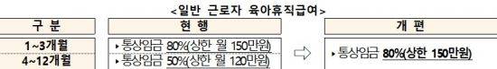 아울러 육아휴직 급여 소득대체율도 인상한다. 생후 12개월 미만 자녀가 있는 부모의 경우, 자녀가 4~12개월일 때 80%(상한액=월 150만원)까지 지원하게 된다. 기존엔 육아휴직 3개월까지만 월 통상임금의 80%(상한 150만원)까지 지원하고 4개월 이후 12개월까지는 50%만 줬다. 아울러 한부모 근로자도 7~12개월 육아휴직 급여를 통상임금 50%에서 80%(상한 150만원)로 올린다.