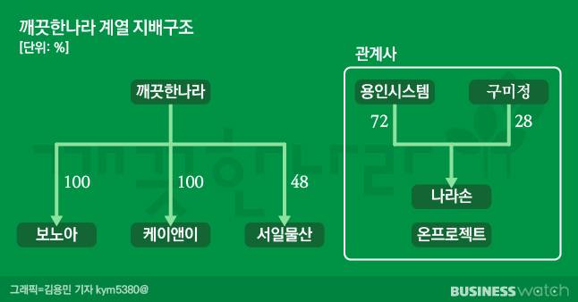 나라손은 1993년 4월 설립된 ‘계명물산’을 전신으로 한 화장지 제조업체다. 용인시스템이 1대주주로서 지분 72%를 보유 중이다. 나머지 28%는 최 회장의 부인 구미정씨 소유다. 나라손은 2020년 매출(177억원) 중 깨끗한나라 몫이 96%(170억원)에 이를 정도로 매출을 절대적으로 깨끗한나라에 의존한다.