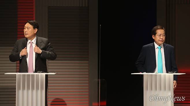 | ▲ 국민의힘 윤석열(왼쪽), 홍준표 대선 경선 예비후보가 지난 28일 서울 상암동 MBC에서 열린 대선 경선 예비 후보자 4차 방송토론회에서 방송 준비를 하고 있다. |