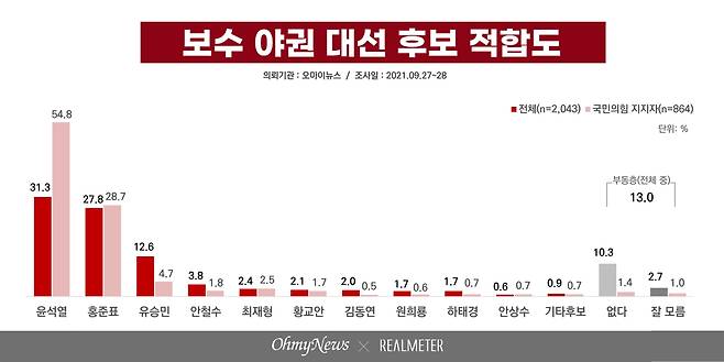 '보수 야권의 대선 후보로 누가 가장 적합하다고 생각하는가'를 묻고 10명의 선택지를 제시한 결과, 윤석열 국민의힘 대선경선 후보(전 검찰총장)가 31.3%, 홍준표 국민의힘 대선경선 후보(국회의원)가 27.8%로 나타났다.