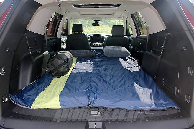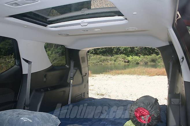 주변에 강물이 흐르는 적당한 곳에 차를 세우고 차박을 위한 세팅에 나섰다. 트래버스는 2·3열 좌석을 다 접으면 신장 2m인 사람도 편히 누울 수 있는 널찍한 차박 공간을 만들 수 있다. 높이도 제법 충분해 앉았을 때 머리가 천장에 닿지 않는다. 그래서 이미 캠핑·차박 동호회에선 함께 여행을 떠나기 좋은 차로 알려져 있다. 다만 2열 좌석 사이에 빈 공간이 생겨 구조물이 필요할 수도 있다. 천장은 듀얼 선루프가 위치해 개방감이 크다. 누우면 하늘이 바로 보여 낭만적이기 까지 하다.